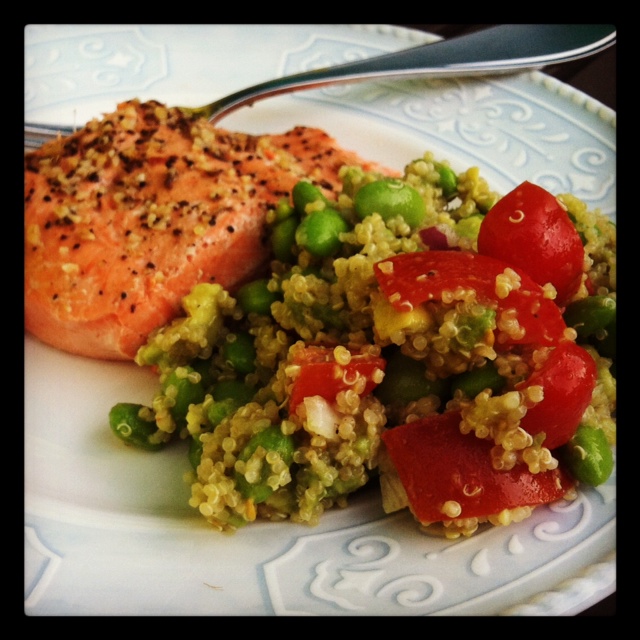 Long days in the sun, on the lake, and at the pool often require quick and easy summer dinners.  Our Sunday dinner was grilled salmon and a quinoa salad.  All ready in less than 30 minutes.